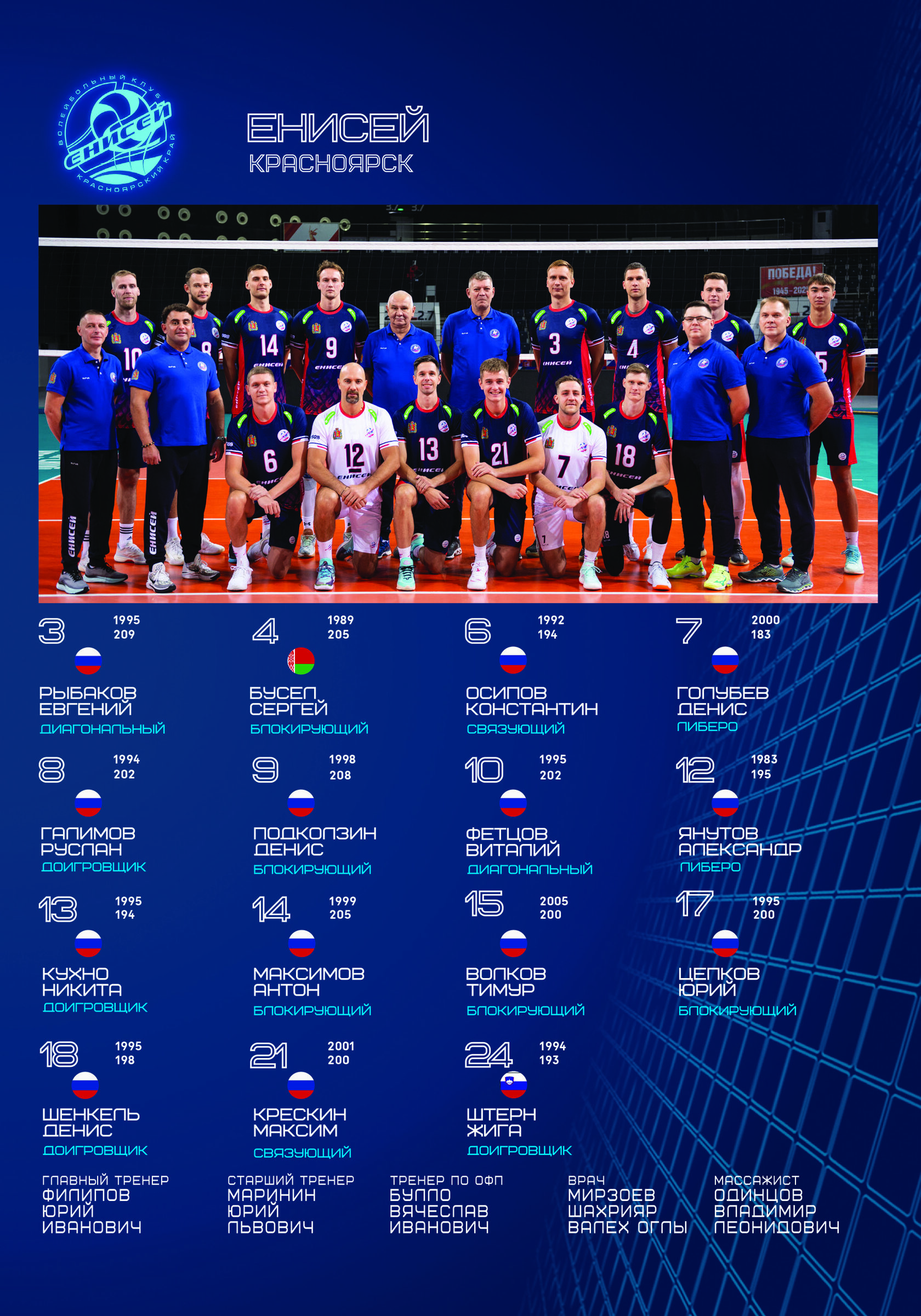 Красноярский «Енисей» последние годы имел репутацию крепкого середняка, способного неприятно удивить многих лидеров. Но летом клуб расстался со своими главными забойщиками — диагональным Романом Мурашко и доигровщиками Семеном Дмитриевым и Максимом Бочаровым. В Ярославль отправился тезка главного тренера команды центральный блокирующий Игорь Филиппов. Заменить этих волейболистов должны были пришедшие в команду Евгений Рыбаков, Юрий Цепков, Денис Шенкель и доигровщик из Словении Жига Штерн.